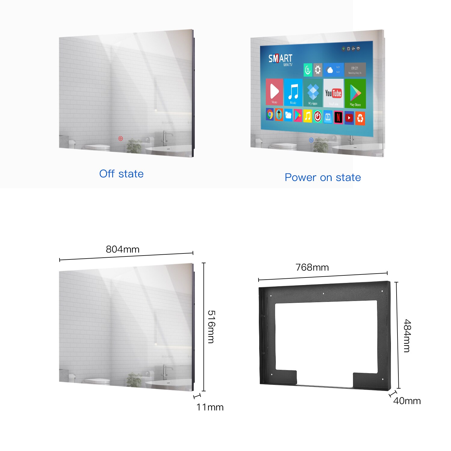 Our main products are Smart Touchscreen Mirror TVs, Mirror TVs, Bathroom TVs and Shower TVs etc.